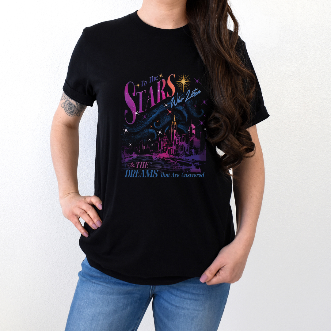 Indulge your love for ACOTAR and SJM with our Court of Dreams City of Velaris t-shirt. The brightly-colored design captures the essence of the series on a soft, black cotton shirt. Join the fandom and make a statement with this must-have for any fan!