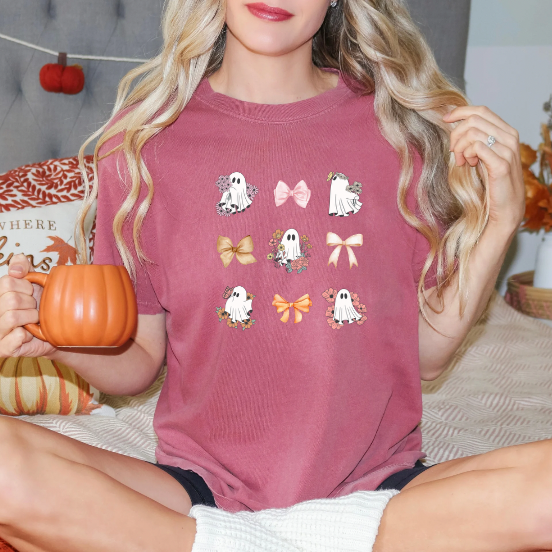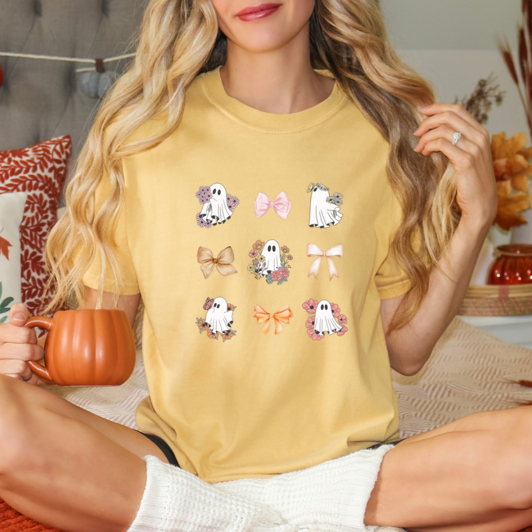 Get ready to spook up your wardrobe with our Demure Ghosties with Bows T-shirt! Featuring a darling and dainty ghosties adorned with flowers, butterflies and bows, this golden yellow or light wine pink cotton tee offers both comfort and style. Perfect for Halloween or any time you want to add a playful touch to your outfit.