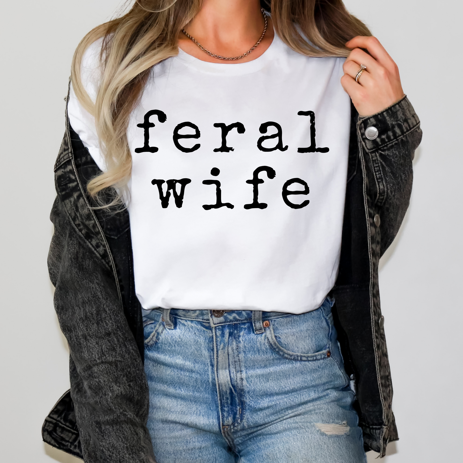 Embrace your wild side with our Feral Wife t-shirt! Made with soft cotton, this comfy tee is perfect for wifey's who aren't afraid to let their feral instincts show. Whether you're lounging at home or out on the prowl, this white tee is a must-have for any feral wife. (Grr-ow!)