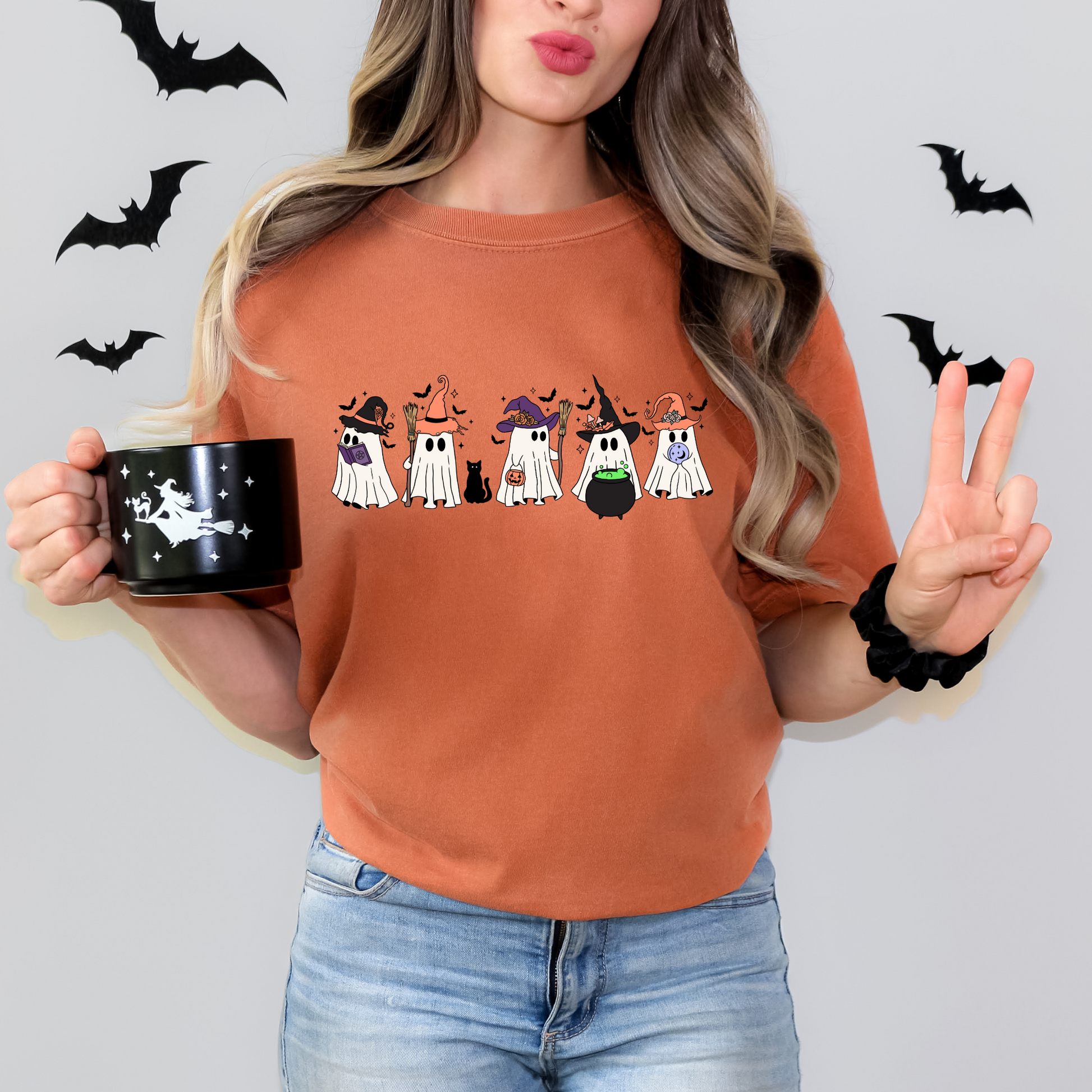 Be part of the spooky fun with Ghost Gang! This burnt orange cotton tee features a playful ghostie gang and cute decals. Perfect for those who don't take themselves too seriously. (No need to be afraid of this ghostie gang, they just want to hang out with you!)