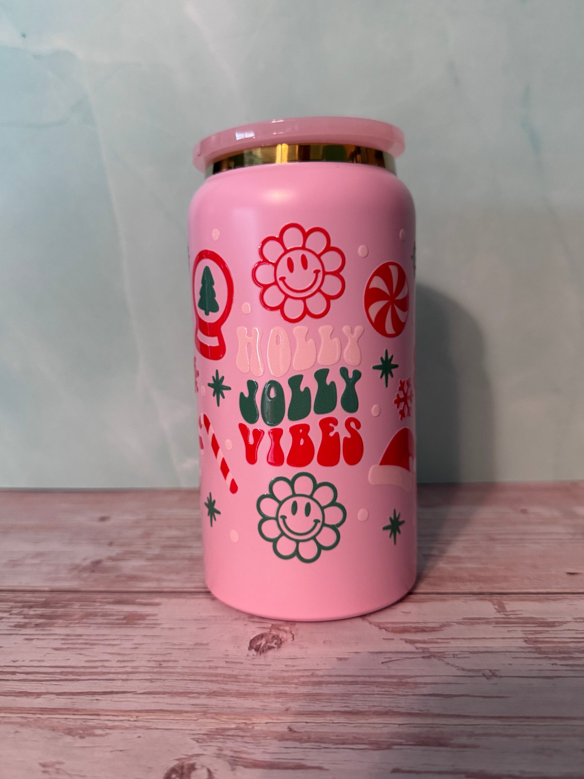 Get in the festive spirit with our Holly Jolly Vibes Can Cup! Made with double-wall stainless steel, it keeps your drinks at the perfect temperature. The acrylic lid and straw make sipping on the go easy and the fun UV decal featuring Fun images and colors to set them five and put you in the Christmas mood.