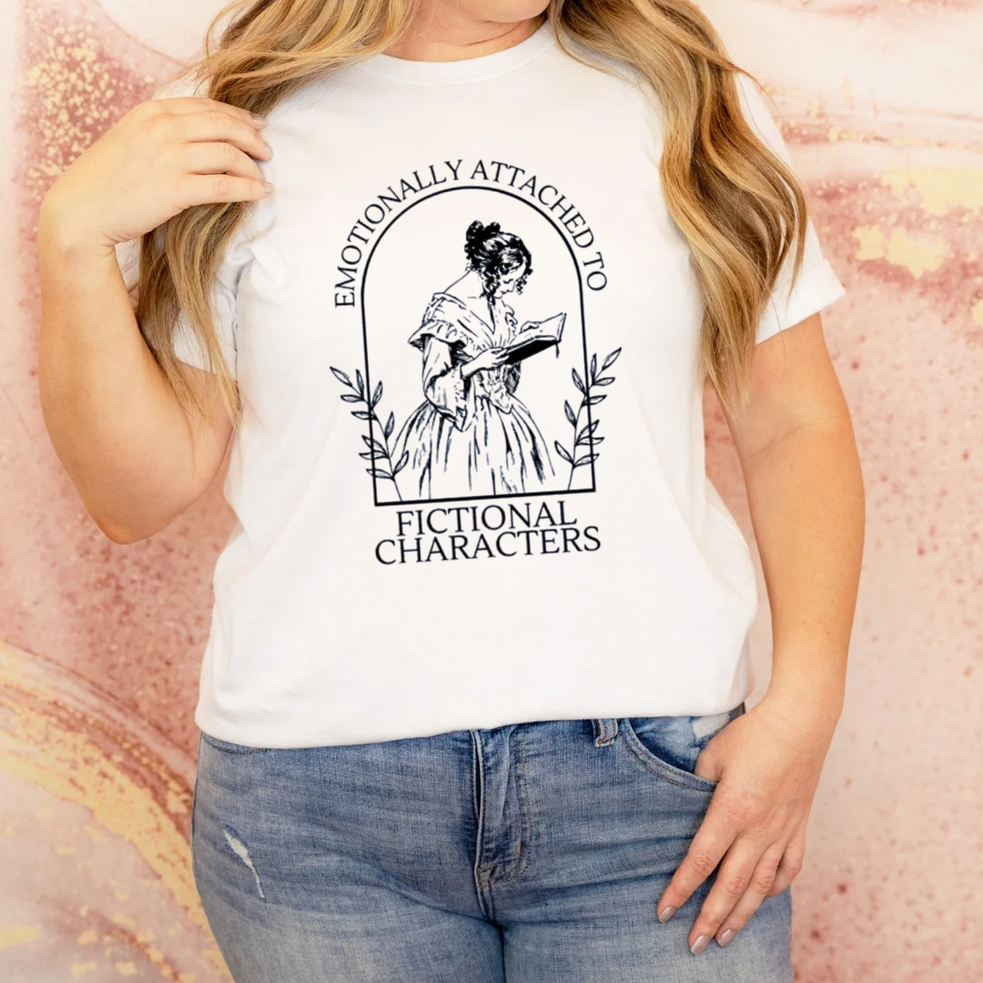 Get emotionally attached to your favorite fictional characters with this quirky t-shirt! Made with soft cotton, this unisex shirt is perfect for book lovers. (Warning: may cause strong emotional connections to fictional beings.)