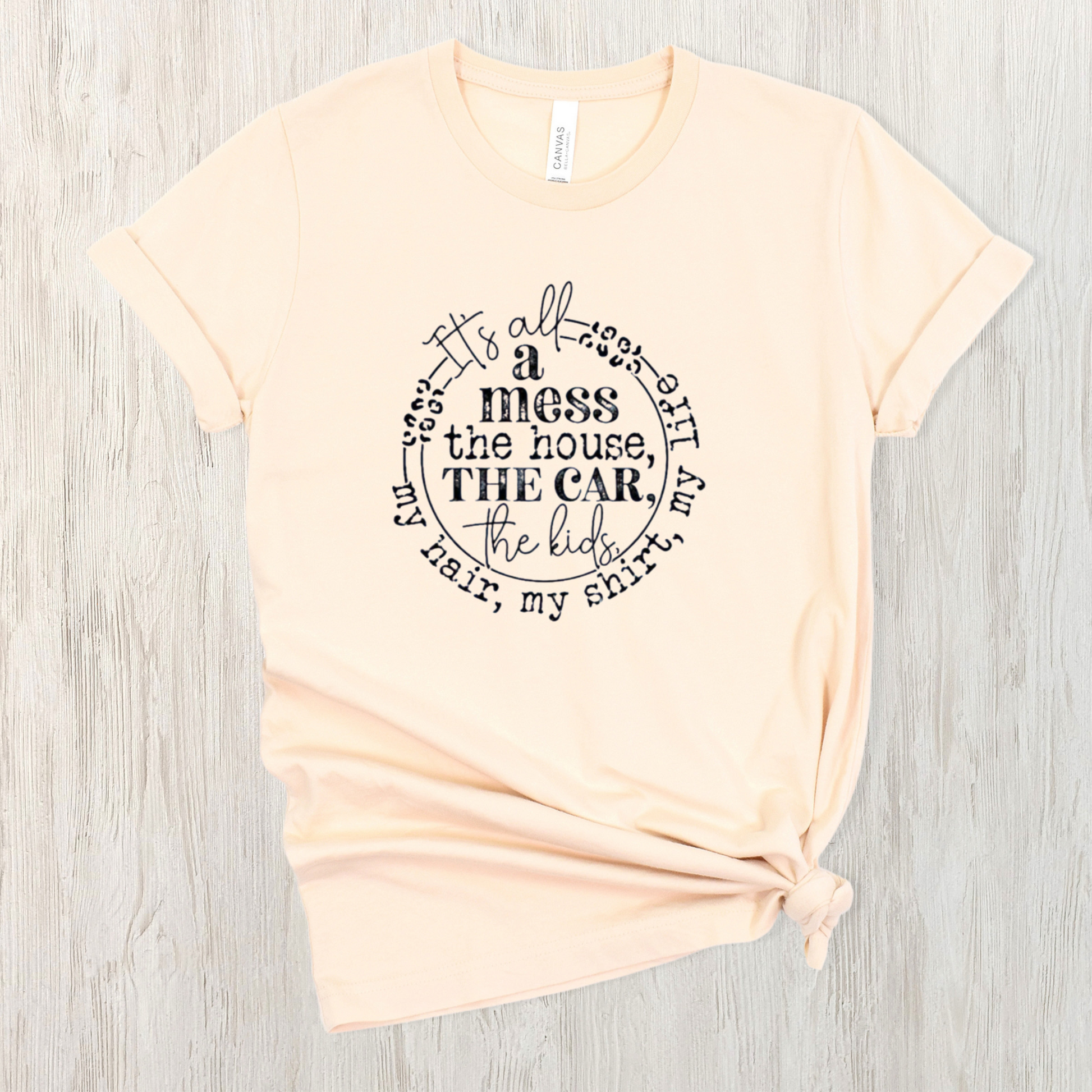 Embrace your messy side with the It's All A Mess T-Shirt. Made from natural colored cotton, this quirky tee is perfect for those days when your hair, shirt, and life are all a mess—not to mention the house, the car, and the kids! A playful reminder that no one is perfect.