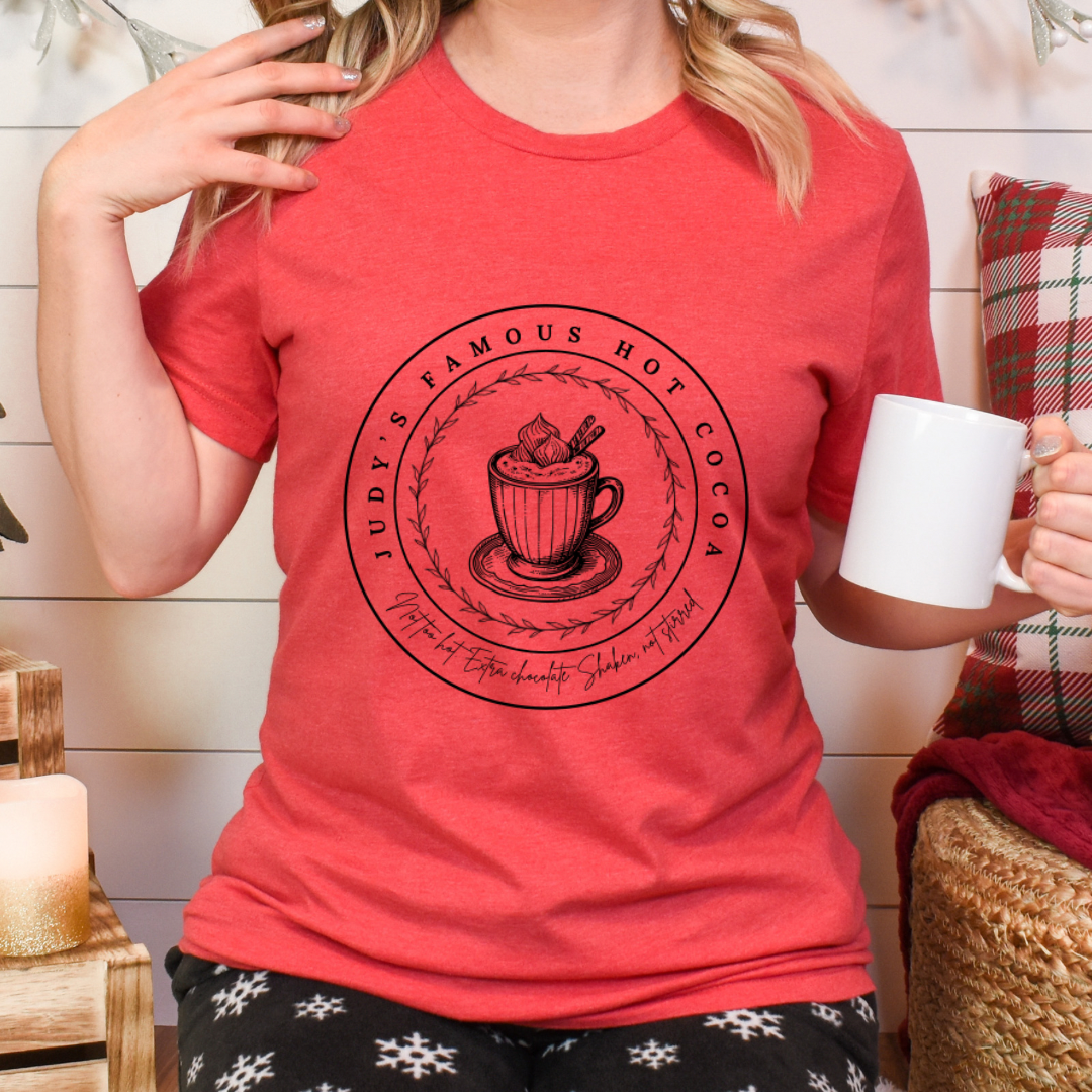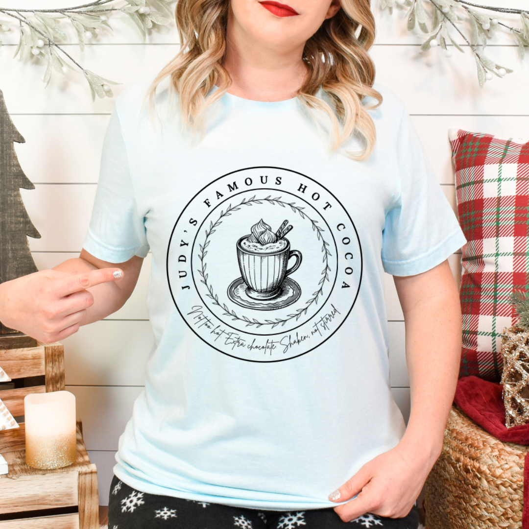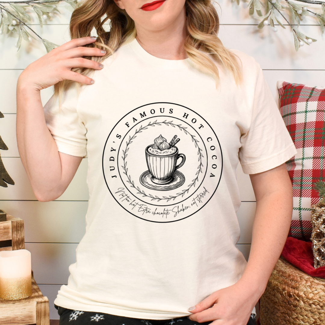 Warm up your holiday season with Judy's Hot Cocoa Christmas Tee Shirt! Show your love for the classic movie The Santa Clause and stay cozy all season long! Perfect for hot cocoa and holiday movie marathons! Yum!!