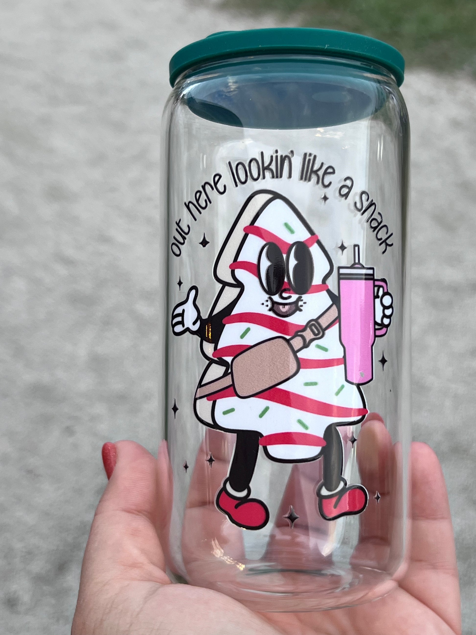 This Lookin' like a snack Glass Can is just what you need to turn heads this season! Get your hands on this little Debbie Christmas tree treat-inspired glass more snackabble than ever! It's all fun and games until you find yourself lookin' like a snack.
