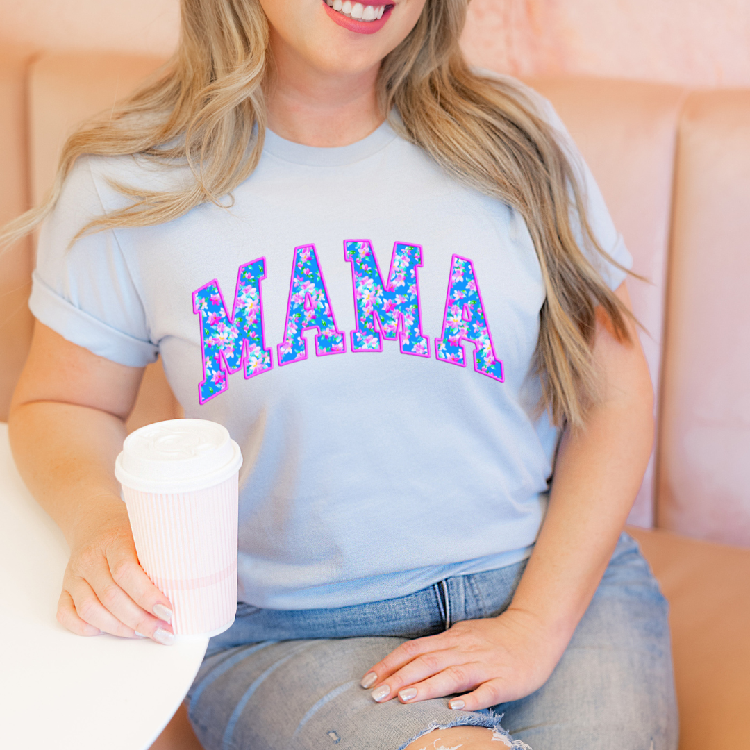 Rock your "mama" status with our light blue Bella Canvas T-shirt adorned with bold blue and fushia letters. A playful and stylish choice for everyday wear, it's also a great way to show off your love for Motherhood! (Tee-riffic!)
