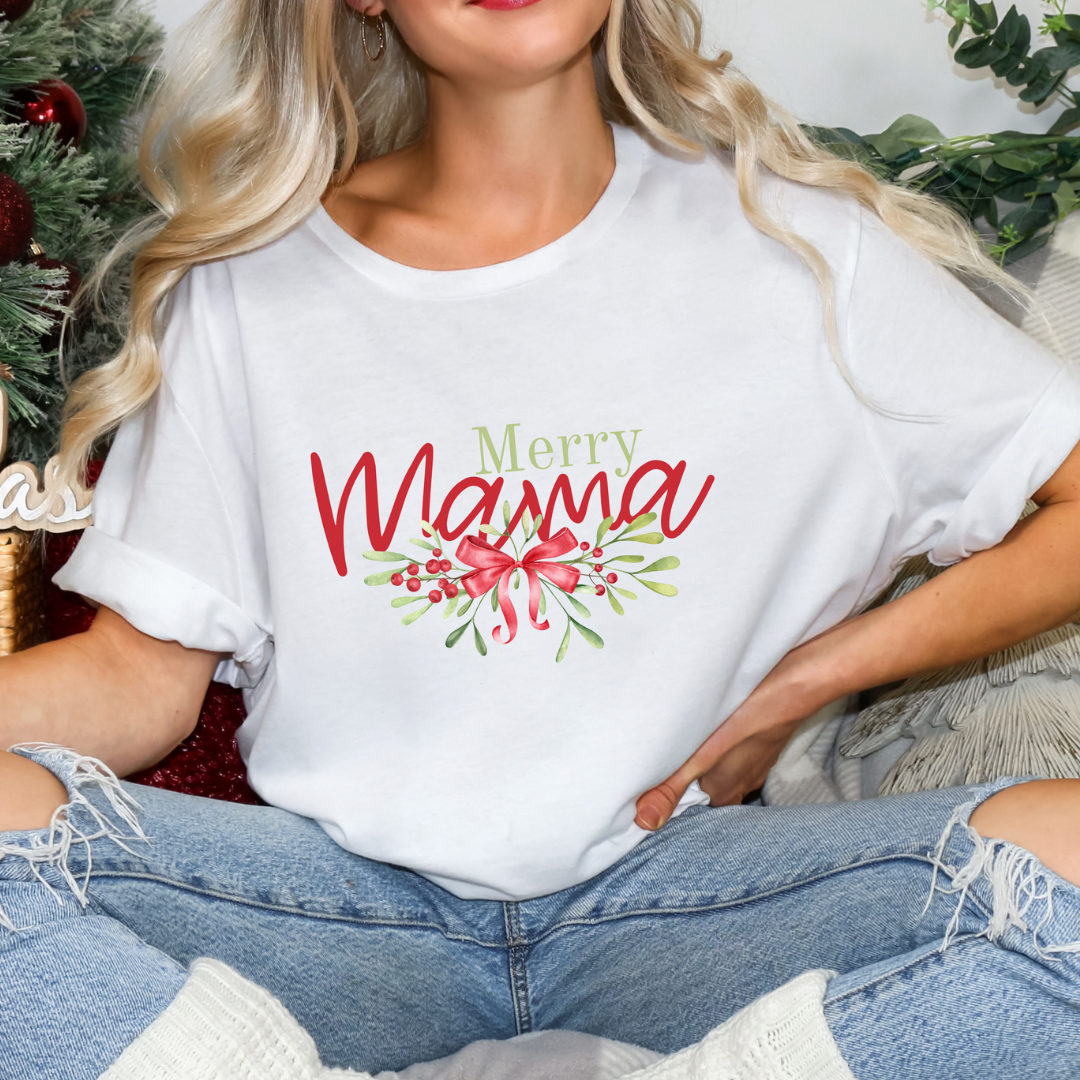 Add some holiday cheer to your wardrobe with Merry Mama! Featuring a handmade mistletoe decal on a soft natural T-shirt, this shirt is perfect for any Mrs. Claus on the go. Spread some love and laughter with Mary Mama.