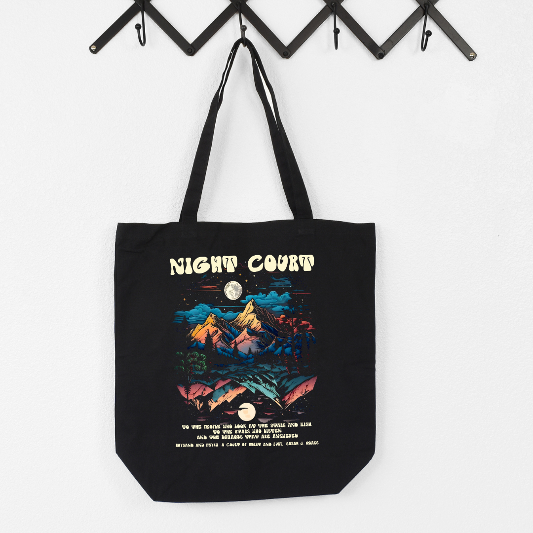 Unleash your inner bookworm with our Vibrant Night Court tote bag! Featuring the stunning City of Starlight from the popular ACOTAR series, this bag boasts eye-catching colors on a sleek black background. Perfect for any fan looking to add some magic to their lives.