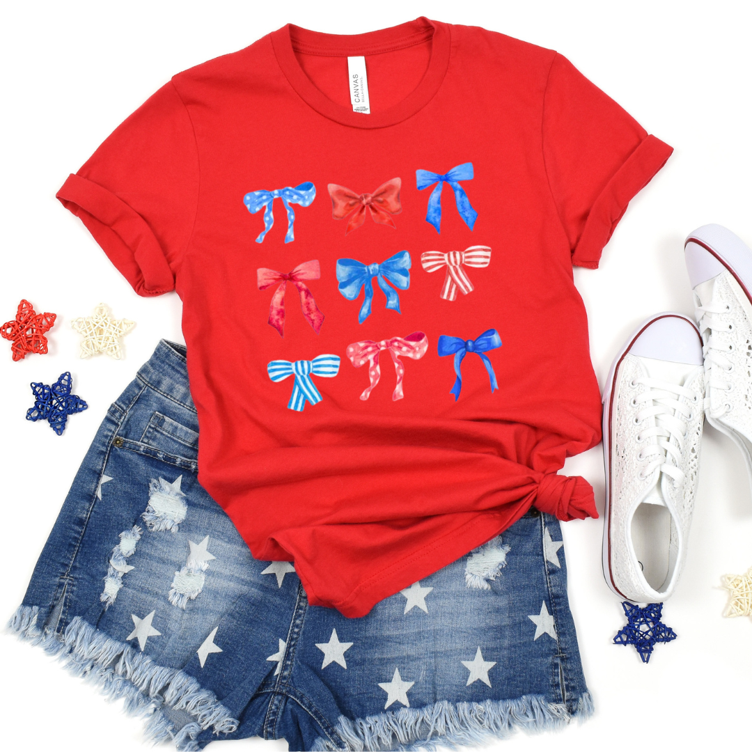 Dress to impress with Red, White, & Bows! This Bella+Canvas unisex t-shirt features a unique coquette style with red, white, and blue bows, perfect for showing off your patriotic spirit. Stand out from the crowd in this vibrant and playful shirt. (USA! USA!)