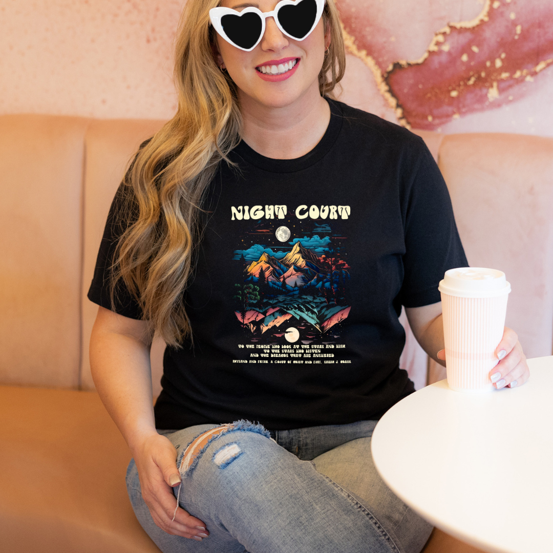 Unleash your inner bookworm with our Vibrant Night Court t-shirt! Featuring the stunning City of Starlight from the popular ACOTAR series, this shirt boasts eye-catching colors on a sleek black background. Perfect for any fan looking to add some magic to their wardrobe.